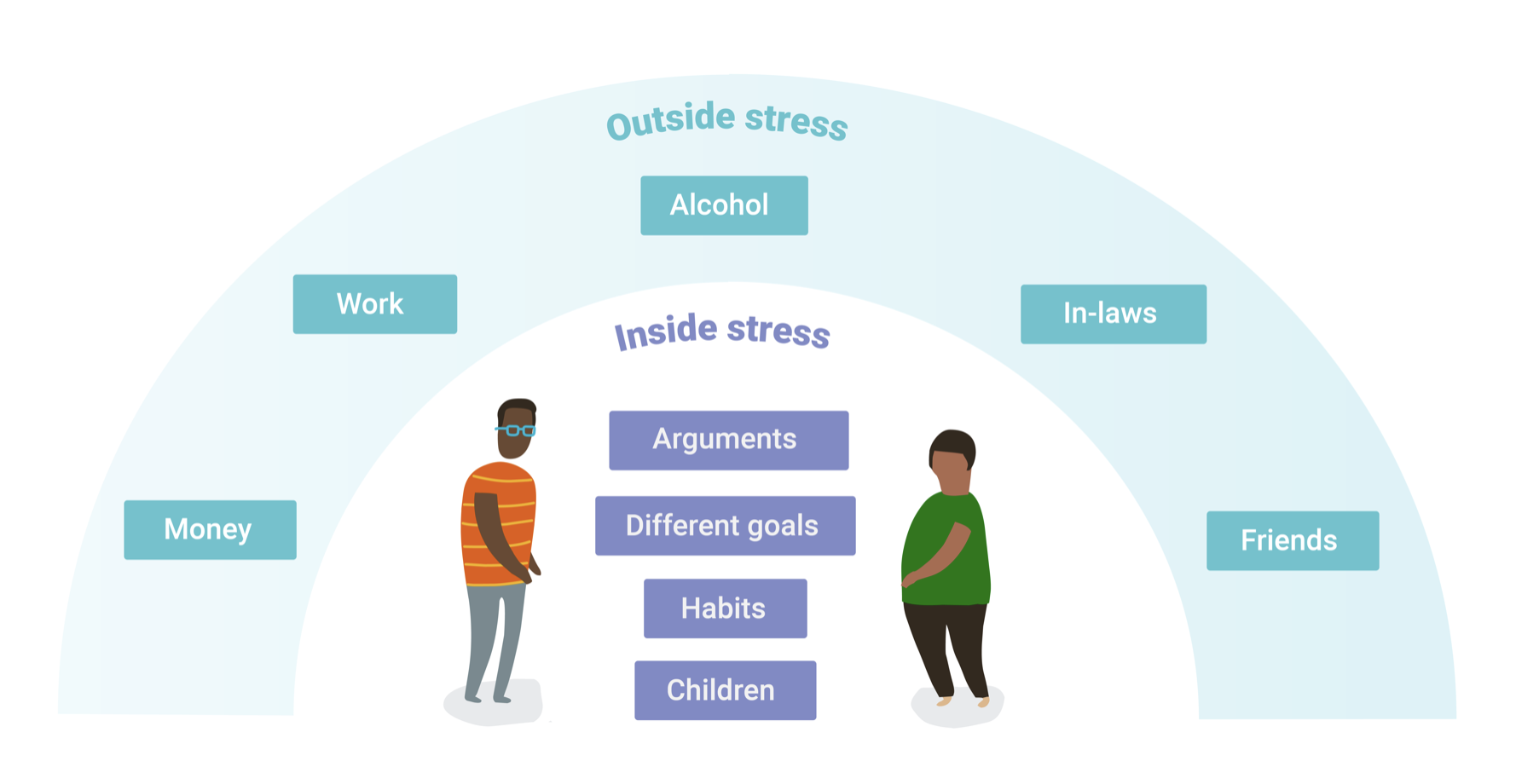 INSIDE STRESS is stress that is directly connected to your relationship with your partner. It might include arguments, having different goals, problems with your children, or anything else that affects you both.