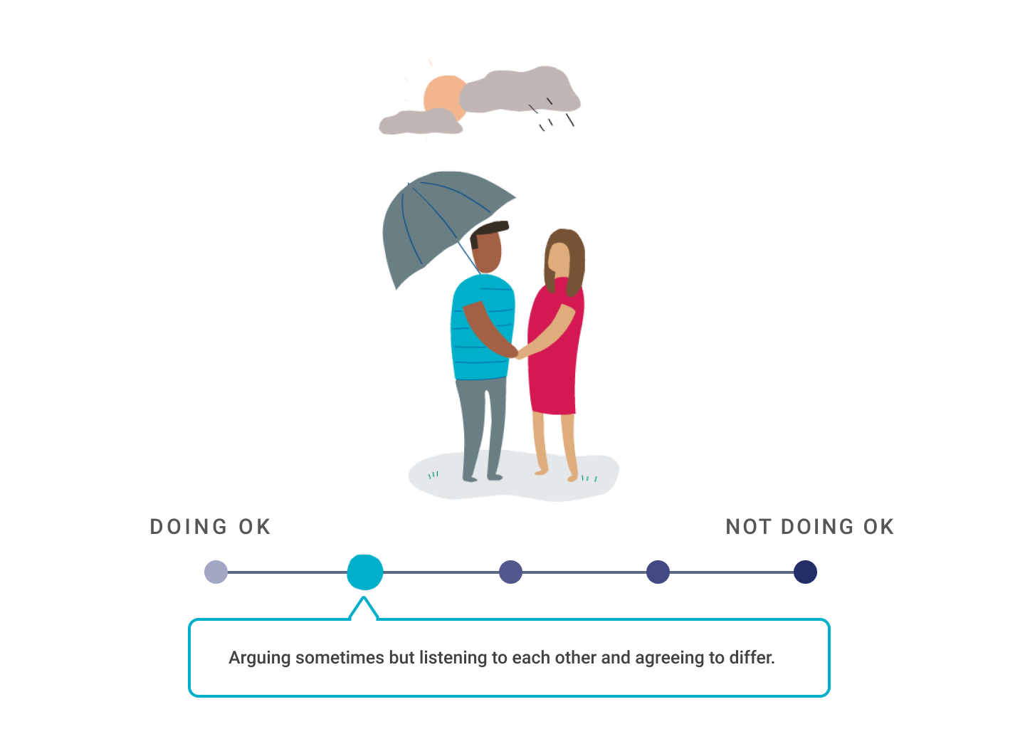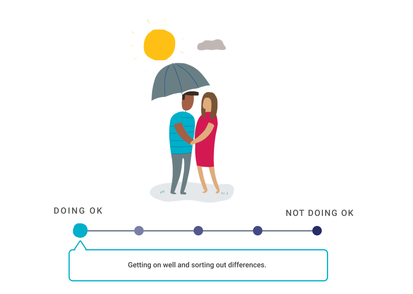 Explain that relationships can move up and down a scale. The umbrella symbolises the factors that help protect relationships during difficult times – humour, affection, time together, support, etc.
