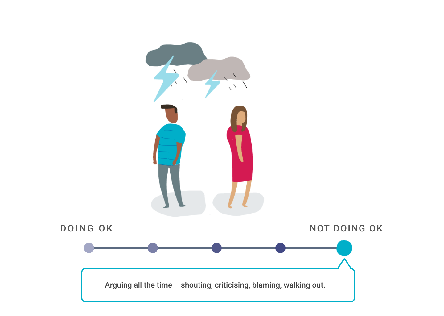 All couples argue but some conflict behaviours are more damaging than others. Encourage the parents to reflect on their own behaviour and how that might make each other feel.